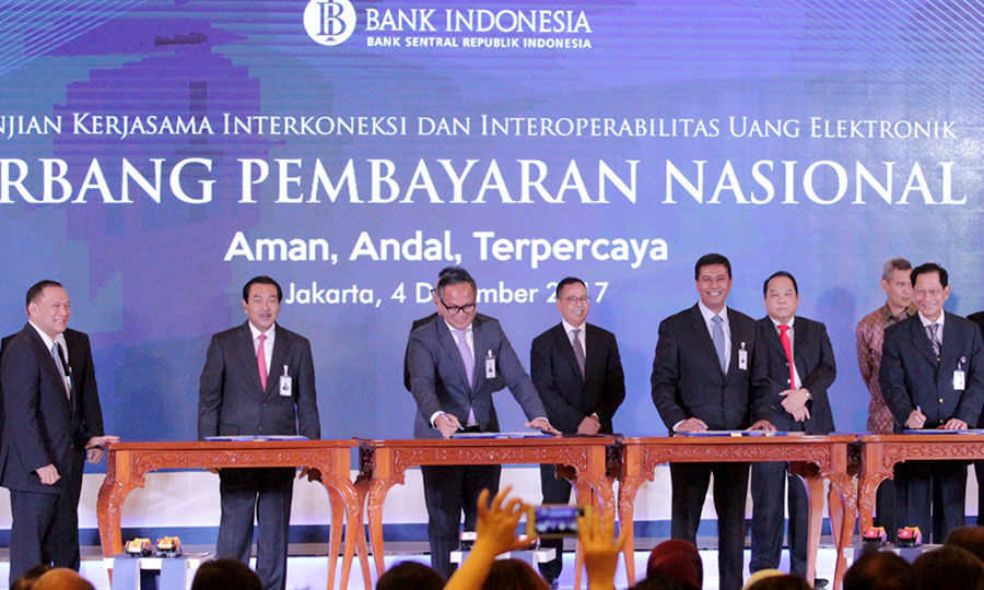 IVOOX.ID, Jakarta - (Kiri – Kanan) Gubernur Bank Indonesia Agus Martowardojo menyaksikan penandatanganan Perjanjian Kerja Sama Konsorsium Pendirian Lembaga Services oleh Direktur Utama PT Bank Rakyat Indonesia Tbk (BRI) Suprajarto, Direktur Utama PT Bank Mandiri Tbk Kartika Wirjoatmodjo, Direktur Utama PT Bank Negara Indonesia Tbk (BNI) Ahmad Baiquni, Presiden Direktur PT Bank Central Asia Tbk (BCA) Jahja Setiaatmadja, Direktur Utama PT Artajasa Pembayaran Elektronis Bayu Hanantesana, dan Direktur Utama PT Rintis Sejahtera Iwan Setiawan dalam rangka Peluncuran Gerbang Pembayaran Nasional di Jakarta, Senin (04/12). Gerbang Pembayaran Nasional diluncurkan dalam rangka memastikan terselenggaranya pemrosesan seluruh transaksi pembayaran ritel domestik secara interkoneksi dan interoperabilitas yang aman, efisien, andal, dan lancar. Nantinya, Gerbang Pembayaran Nasional juga akan mendukung program pemerintah, seperti bantuan sosial non tunai, strategi nasional keuangan inklusif, elektronifikasi jalan tol dan GNNT yang ditujukan untuk.FOTO/THORIQ