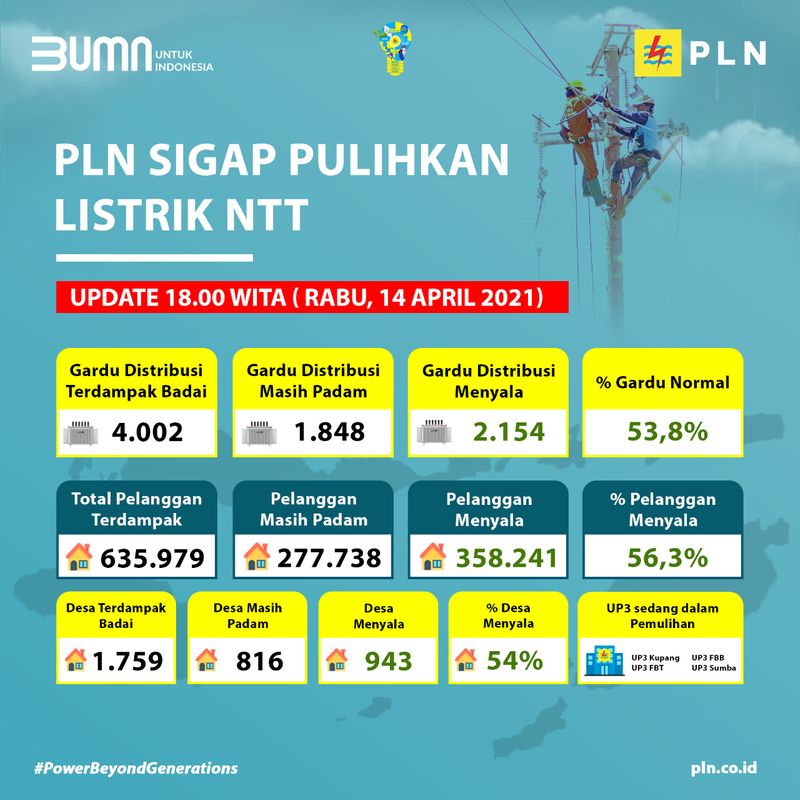 Sistem kelistrikan yang terdampak bencana badai seroja di NTT terus berangsur pulih. Hingga Rabu (14/04) siang pukul 18.00 WITA, PLN telah berhasil menyalakan kembali 2.154 gardu distribusi sehingga sebanyak 358.241 pelanggan dapat kembali menikmati listrik.