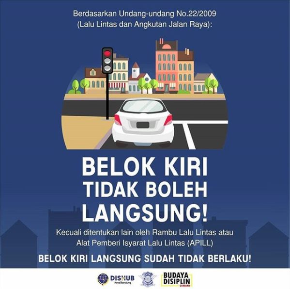 Peraturan tersebut sudah diatur dalam UU No. 29 Tahun 2009 tentang Lalu Lintas dan Angkutan Jalan Raya. Pada Pasal 112 ayat 3 berbunyi “"Pada persimpangan Jalan yang dilengkapi Alat Pemberi Isyarat Lalu Lintas, Pengemudi Kendaraan dilarang langsung berbelok kiri, kecuali ditentukan lain oleh Rambu Lalu Lintas atau Alat Pemberi Isyarat Lalu Lintas."