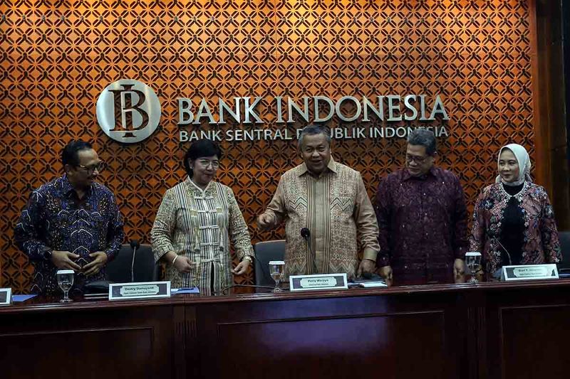 IVOOX.id - Gubernur Bank Indonesia Perry Warjiyo (tengah) berbincang dengan Deputi Gubernur Senior BI Destry Damayanti, Deputi Gubernur BI Juda Agung (kiri), Doni Primanto Joewono (kedua kanan) dan Aida S. Budiman (kanan) sebelum menyampaikan hasil Rapat Dewan Gubernur BI bulan Agustus 2023 di Bank Indonesia, Jakarta, Kamis (24/8/2023). Rapat Dewan Gubernur (RDG) Bank Indonesia bulan Agustus 2023 memutuskan untuk mempertahankan suku bunga acuan atau BI 7-Day Reverse Repo Rate (BI7DRR) sebesar 5,75 persen, suku bunga Deposit Facility sebesar 5 persen dan suku bunga Lending Facility sebesar 6,50 persen. ANTARA FOTO/Asprilla Dwi Adha