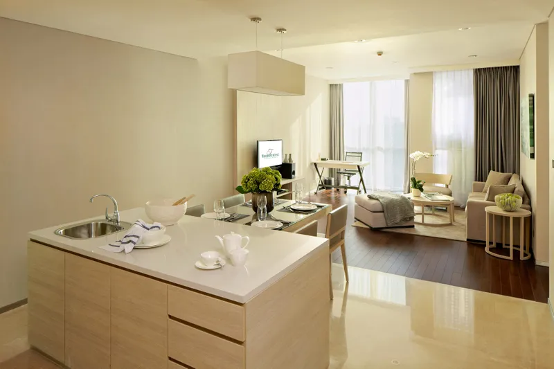 Bagi keluarga atau tamu yang menginginkan lebih banyak ruang, Fraser Residence Menteng Jakarta menawarkan unit 2 Bedroom (90 m2) dan 3 Bedroom (124 m2) yang dirancang dengan konsep hunian luas ala residence. Setiap unit dirancang untuk menghadirkan kenyamanan “welcome home” dengan ruang tamu dan area makan yang lapang, serta dapur lengkap yang dilengkapi peralatan memasak dan perlengkapan makan esensial, termasuk pisau dan bottle opener. Konsep ini memungkinkan tamu menikmati pengalaman menginap seperti di rumah sendiri, namun tetap dengan layanan profesional khas hotel bintang lima.