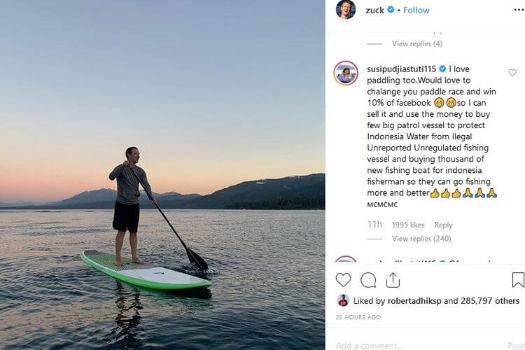 Tantangan ini Susi ajukan melalui sebuah kolom komentar di laman media sosial Instagram Zuckenberg, usai dia mengunggah foto dirinya sedang menaiki paddle pada Senin (8/7). Dia menuliskan keterangan "Tahoe sunset" pada unggahannya itu.