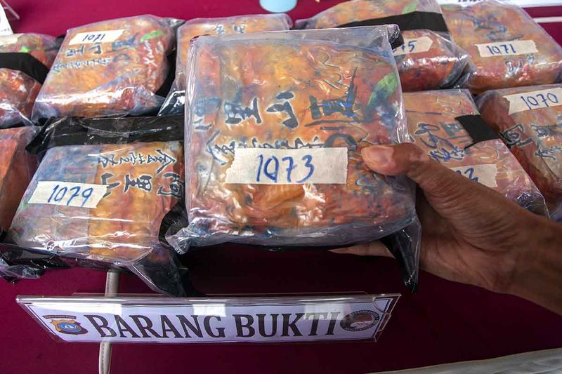 Petugas kepolisian memperlihatkan barang bukti narkotika jenis sabu saat rilis pengungkapan kasus tersebut di Polresta Barelang,Batam, Kepulauan Riau, Rabu (16/8/2023). Polresta Barelang menangkap tiga orang tersangka dan menyita barang bukti narkotika jenis sabu seberat 10,720 kg dan 903,60 gram di dua lokasi yang berbeda di Batam. ANTARA FOTO/Teguh Prihatna