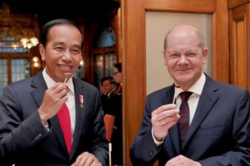 Saat tiba di Guesthouse Lower Saxony, Jokowi disambut Kanselir Jerman Olaf Scholz bersama Presiden Menteri Negara Bagian Lower Saxony Stephan Weil.