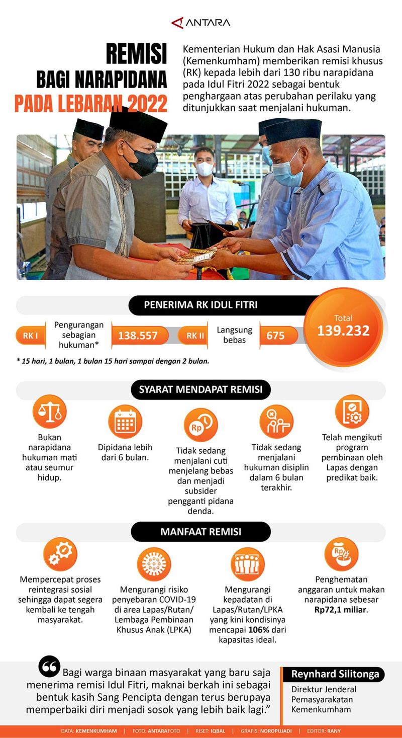 Kementerian Hukum dan Hak Asasi Manusia (Kemenkumham) memberikan remisi khusus (RK) kepada lebih dari 130 ribu narapidana pada Idul Fitri 2022 sebagai bentuk penghargaan atas perubahan perilaku yang ditunjukkan saat menjalani hukuman. (Antara)