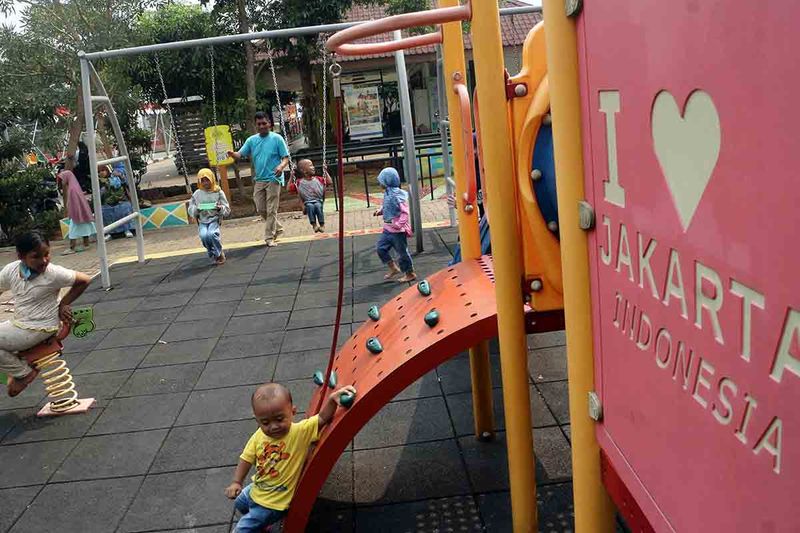 Warga bersama anaknya bermain di kawasan ruang terbuka hijau Garuda, Jakarta Timur, Minggu (27/8/2023). Pemerintah Provinsi DKI Jakarta melanjutkan program?beautifikasi?melalui penataan wilayah dengan melakukan penanaman pohon dan memperluas ruang terbuka hijau (RTH) guna memperbaiki kualitas udara di DKI. ANTAR FOTO/Yulius Satria Wijaya